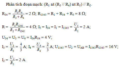 Cho mạch điện như hình vẽ. Trong đó R1 = R3 = R5 = 3Ω; R2 = 8Ω; R4 = 6Ω; U5 = 6 V. Tính điện trở tương đương của đoạn mạch AB và cường độ dòng điện chạy qua từng điện trở.