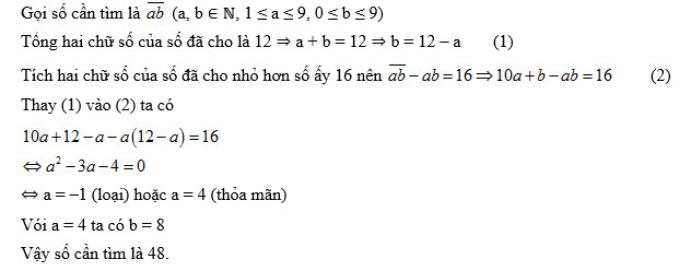 Cho một số có hai chữ số. Tổng hai chữ số của chúng bằng 12. Tích hai chữ số ấy nhỏ hơn số đã cho là 16. Tìm số đã cho