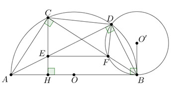 Cho nửa đường tròn \(\left( O \right)\) đường kính \(AB\), trên nửa đường tròn lấy điểm \(C.\) Gọi \(H\) là hình chiếu của \(C\) trên đường thẳng \(AB.\) Trên cung \(CB\) lấy điểm \(D,\) hai đường thẳng \(AD\) và \(CH\) cắt nhau tại \(E.\) Gọi \(\left( {O'} \right)\) là đường tròn đi qua \(D\) và tiếp xúc với \(AB\) tại \(B.\) Đường tròn \(\left( {O'} \right)\) cắt \(CB\) tại \(F.\) Chứng minh rằng \(EF\parallel AB\).