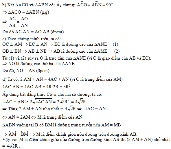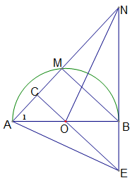 Cho nửa đường tròn tâm O đường kính AB = 2R. Điểm M di chuyển trên nửa đường tròn (M khác A và B). C là trung điểm của dây cung AM. Đường thẳng d là tiếp tuyến với nửa đường tròn tại B. Tia AM cắt d tại điểm N. Đường thẳng OC cắt d tại E.
