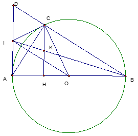 Cho nửa đường tròn tâm O đường kính AB = 2R. Trên nửa đường tròn lấy điểm C (C khác A và B). Gọi D là giao điểm của đường thẳng BC với tiếp tuyến tại A của nửa đường tròn tâm O và I là trung điểm của AD.