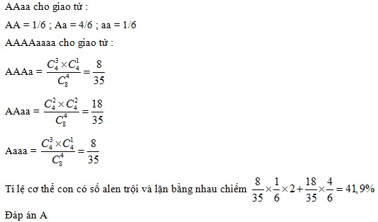 Cho phép lai: AAAAaaaa x AAaa. Nếu giảm phân và thụ tinh bình thường không có đột biến xảy ra thì tỉ lệ cơ thể con có số alen trội và lặn bằn nhau chiếm:
