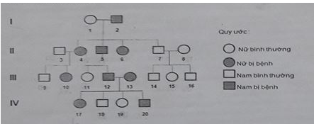 Tính trạng di truyền liên tục qua các thế hệ biết bố mẹ 12 x 13 bị bệnh nhưng sinh con 19 không bị bệnh => bệnh do gen trội quy định => 5 sai .