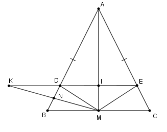 b) Trên cạnh \(AB\) lấy điểm \(D,\) trên cạnh \(AC\) lấy điểm \(E\) sao cho \(AD = AE.\) Chứng minh \(MD = ME.\)