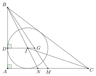 Gọi \(N\) là giao điểm của \(BI\) và \(AC,\) ta có: \(ID\) // \(AC\) (cùng vuông góc với \(AB\)), suy ra: