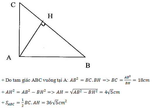 Cho tam giác ABC vuông tại A, đường cao AH. Biết AB = 12cm, BH = 8cm, tính độ dài các đoạn thẳng BC, AH và diện tích tam giác ABC.