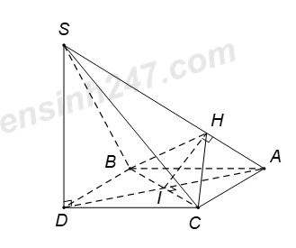 Tính được \(AI=\frac{a\sqrt{3}}{2}\), \(AD=2AI=a\sqrt{3}\), \(S{{A}^{2}}=\sqrt{A{{D}^{2}}+S{{D}^{2}}}=\frac{3a\sqrt{2}}{2}.\)