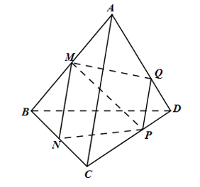 Cho tứ diện ABCD có M, N theo thứ tự là trung điểm của AB, BC. Gọi P là điểm thuộc cạnh CD sao cho \(CP = 2PD \) và Q là điểm thuộc cạnh AD sao cho bốn điểm M, N, P, Q đồng phẳng. Khẳng định nào sau đây là đúng?