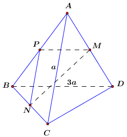 Cho tứ diện \(ABCD\) có\(AC = a,\,\,BD = 3a\). Gọi \(M\) và \(N\) lần lượt là trung điểm của \(AD\) và \(BC.\) Biết \(AC\) vuông góc với\(BD\). Tính độ dài đoạn thẳng \(MN\) theo \(a.\)