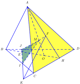Cho tứ diện \(ABCD\). Gọi \(O\) là một điểm nằm bên trong tam giác \(BCD\) và \(M\) là một điểm trên đoạn \(AO\). Gọi \(I,\,\,J\) là hai điểm trên cạnh \(BC,\,\,BD\). Giả sử \(IJ\) cắt \(CD\) tại \(K\), \(BO\) cắt \(IJ\) tại \(E\) và cắt \(CD\) tại \(H\), \(ME\) cắt \(AH\) tại \(F\). Giao tuyến của hai mặt phẳng \(\left( {MIJ} \right)\) và \(\left( {ACD} \right)\) là đường thẳng: