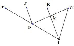 Xét tam giác BRI có: J là trung điểm của BR, \(DJ//RI \Rightarrow D\) là trung điểm của BI.