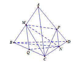 Lại có \({{V}_{AMPC}}=\frac{AM}{AB}.\frac{AP}{AD}.{{V}_{ABCD}}\)\(=\frac{1}{2}.\frac{2}{3}{{V}_{ABCD}}=\frac{1}{3}{{V}_{ABCD}}\) \({{V}_{MQNC}}=\frac{1}{2}{{V}_{AQNC}}=\frac{1}{2}\frac{CQ}{CB}.\frac{CN}{CD}.{{V}_{ABCD}}\)\(=\frac{1}{2}\frac{1}{2}.\frac{2}{3}{{V}_{ABCD}}=\frac{1}{2}{{V}_{ABCD}}\) \({{V}_{MPNC}}=\frac{2}{3}{{V}_{MPCD}}=\frac{2}{3}.\frac{1}{3}{{V}_{MACD}}\)\(=\frac{2}{3}.\frac{1}{3}\frac{AM}{AB}.{{V}_{ABCD}}\)\(=\frac{2}{3}.\frac{1}{3}\frac{1}{2}{{V}_{ABCD}}=\frac{1}{9}{{V}_{ABCD}}\)