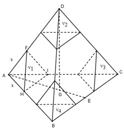 Tương tự ta có: \({V_2} = {V_3} = {V_4} = \dfrac{{{x^3}\sqrt 2 }}{{12}}\)