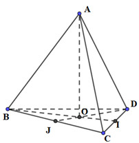 Gọi O là tâm của tam giác đều BCD; I, J lần lượt là trung điểm của CD, BC; độ dài các cạnh của tứ diện ABCD là a.