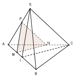 \(\begin{array}{l}MP\parallel SI \Rightarrow \frac{{MP}}{{SI}} = \frac{{AM}}{{AI}} = \frac{{AP}}{{AS}} \Leftrightarrow \frac{{MP}}{{\frac{{AB\sqrt 3 }}{2}}} = \frac{x}{{\frac{{AB}}{2}}} \Rightarrow MP = \frac{{\frac{{AB\sqrt 3 }}{2}x}}{{\frac{{AB}}{2}}} = x\sqrt 3 \PN\parallel SC \Rightarrow \frac{{AP}}{{AS}} = \frac{{PN}}{{SC}} \Rightarrow \frac{{PN}}{{SC}} = \frac{{AM}}{{AI}} \Leftrightarrow \frac{{PN}}{{SC}} = \frac{x}{{\frac{{AB}}{2}}} \Leftrightarrow PN = \frac{{xSC}}{{\frac{{AB}}{2}}} = 2x\,\,\left( {SC = AB} \right)\end{array}\)