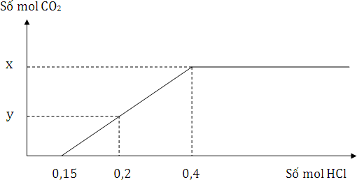 Cho từ từ dung dịch HCl vào dung dịch có chứa 0,15 mol Na2CO3 và 0,1 mol KHCO3. Số mol khí CO2 thu được phụ thuộc vào số mol HCl được biểu diễn bằng đồ thị bên.