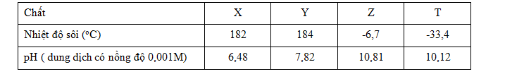 Cho X, Y, Z, T là các chất khác nhau trong số 4 chất : CH3NH2, NH3, C6H5OH( phenol). C6H5NH2(anilin) và các tính chất được ghi trong bảng sau.