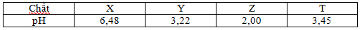 Cho X, Y, Z, T là các chất khác nhau trong số 4 chất: HCOOH; CH3COOH; HCl; C6H5OH.