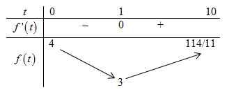 Xét hàm số \(f\left( t \right) = \dfrac{{{t^2} + 3}}{{t + 1}} + 1\) với \(t \in \left[ {0;10} \right]\) ta có: