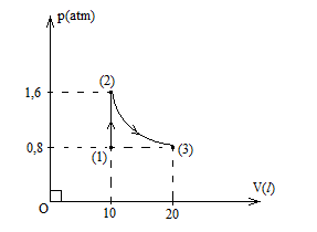 Một khối khí lí tưởng có thể tích 10 lít, nhiệt độ 270C, áp suất 0,8atm. Biến đổi qua hai quá trình sau : đẳng tích nhiệt độ tăng thêm 300K và đẳng nhiệt thể tích sau cùng 20 lít.