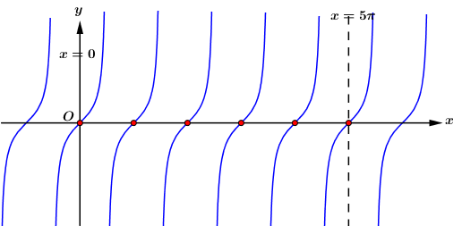 Dựa vào đồ thị hàm số ta thấy trên đoạn \(\left[ {0;5\pi } \right]\), đồ thị hàm số cắt trục hoành tại 6 điểm phân biệt (điểm màu đỏ), do đó có 6 giá trị \(x \in \left[ {0;5\pi } \right]\) để hàm số \(y = \tan x\) nhận giá trị bằng 0.