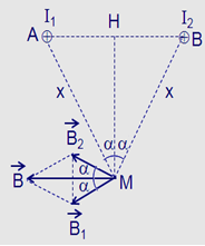 \(B = {B_1}cosa + {B_2}cosa = 2{B_1}cosa = 2{B_1}\frac{{HM}}{{AM}} = {2.2.10^{ - 7}}\frac{I}{x}\frac{{\sqrt {{x^2} - {{\left( {\frac{d}{2}} \right)}^2}} }}{x} = {4.10^{ - 7}}I\sqrt {\frac{1}{{{x^2}}} - \frac{{{d^2}}}{{4{x^4}}}} \)
