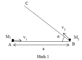 Có hai vật nhỏ M1 và M2, ban đầu cách nhau một khoảng AB = a. Cùng lúc hai vật chuyển động thẳng đều, M2 chuyển động theo đường thẳng AB về phía B với vận tốc v1 = 2v, M2 chuyển động đều theo đường thẳng BC về phía C với vận tốc v2 = v. Tìm khoảng cách giữa nhỏ nhất giữa hai vật và khoảng thời gian từ lúc hai vật bắt đầu chuyển động đến khi khoảng cách giữa hai vật nhỏ nhất. Biết rằng AB hợp với BC một góc ( 0 < < 900) như hình 1.