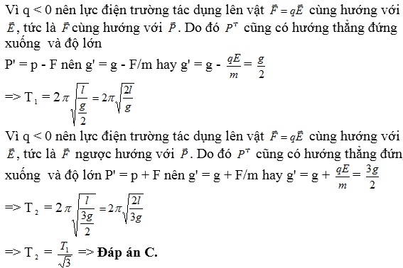 Con lắc đơn có quả cầu tích điện âm dao động điều hòa trong điện trường đều có véc tơ cường độ điện trường thẳng đứng. Độ lớn lực điện bằng một nữa trọng lực. Khi lực điện hướng lên chu kỳ dao động của con lắc là T1 . Khi lực điện hướng xuống chu kỳ dao động của con lắc là