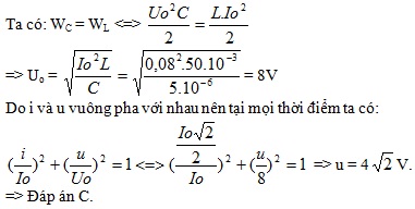 Cường độ dòng điện tức thời trong mạch dao động LC lí tưởng là i= 0,08cos(2000t)(A). Cuộn dây có độ tự cảm L = 50mH. Hiệu điện thế giữa hai bản tụ tại thời điểm cường độ dòng điện tức thời trong mạch bằng cường độ dòng điện hiệu dụng là: