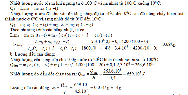b/ Để tạo nên 100g hơi nước ở nhiệt độ 1000C từ nước có nhiệt độ ban đầu 200C bằng bếp dầu có hiệu suất H = 40%. Tìm lượng dầu cần dùng, biết năng suất tỏa nhiệt của dầu là q = 4,5.107J/kg.