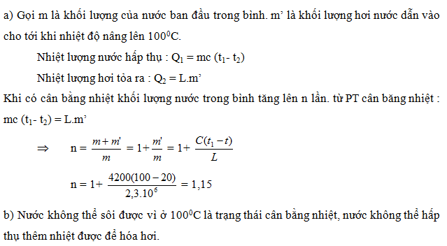 b) Khi nhiệt độ đã đạt được 1000C, nếu tiếp tục dẫn hơi nước ở 1000C vào bình thì có thể làm cho nước trong bình sôi được không? Cho nhiệt dung riêng của nước là 4200J/kg.K ; Nhiệt hóa hơi của nước là 2,3.106J/kg.