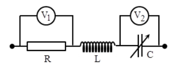Đặt điện áp u = U0cos(ωt + φ) vào hai đầu đoạn mạch RLC như hình vẽ: cuộn cảm thuần có độ tự cảm L, điện dung C của tụ điện có giá trị thay đổi đượC. Điều chỉnh giá trị của điện dung C thì thấy: ở cùng thời điểm, số chỉ của vôn kế V1 cực đại thì số chỉ của vôn kế V1 gấp đôi số chỉ của vôn kế V2. Khi số chỉ của vôn kế V2 cực đại thì tỉ số giữa số chỉ của vôn kế V2 với số chỉ của vôn kế V1 bằng