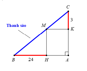 Theo bài ra, thanh sào sẽ đi qua các điểm \(B,\,\,M,\,\,C\) (hình vẽ dưới).
