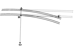 Để giúp xe lửa chuyển từ một đường ray từ hướng này sang một đường ray theo hướng khác, người ta làm xen giữa một đoạn đường ray hình vòng cung (hình bên). Biết chiều rộng của đường ray là AB ≈1,1m, đoạn BC ≈28,4m. Hãy tính bán kính OA = R của đoạn đường ray hình vòng cung?