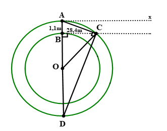 \(\begin{array}{l}{\left( {28,4} \right)^2} \approx 1,1.\left( {2R - 1,1} \right)\\ \Leftrightarrow 2R \approx 807,77\\ \Leftrightarrow R \approx 367,2m\end{array}\)