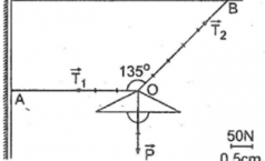 - Lực :\(\overrightarrow {{T_2}} \) Gốc là điểm O, Trùng với phương sợi dây OB, chiều từ O đến B và có độ lớn 250N