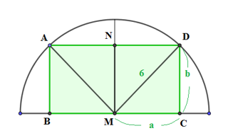 \({{S}_{ABCD}}=2{{S}_{CDNM}}=2.ab\overset{Cauchy}{\mathop{\le }}\,{{a}^{2}}+{{b}^{2}}={{6}^{2}}\Rightarrow {{S}_{\max }}=36\,(c{{m}^{2}})\) khi và chỉ khi \(a=b=3\sqrt{2}\,(cm)\).