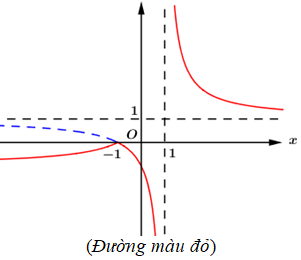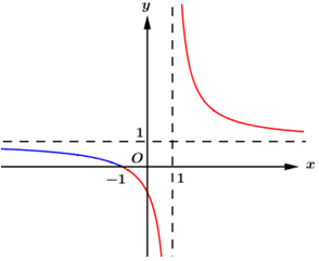 Phần đồ thị ứng với \(x > - 1\) là đồ thị màu đỏ, phần đồ thị ứng với \(x < - 1\) là đồ thị màu xanh.
