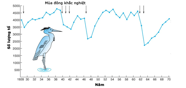 Đồ thị mô tả sự biến động số lượng cá thể của quần thể diệc xám ở Anh từ năm 1928 đến năm 1970. Nghiên cứu sơ đồ và cho biết kết luận nào sau đây là đúng?