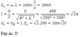 Đoạn mạch gồm điện trở R = 200 W nối tiếp với cuộn thuần cảm L = H, đặt vào hai đầu mạch điện áp . Điện áp hiệu dụng ở hai đầu điện trở R và hai đầu cuộn cảm là