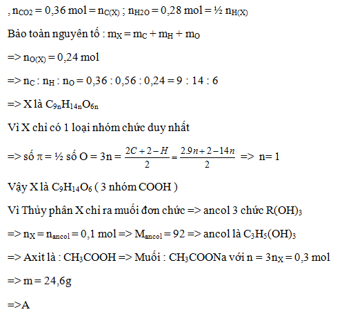 Đốt cháy hoàn 8,72 gam este X (chỉ chứa một loại nhóm chức) thu được 15,84 gam CO2 và 5,04 gam H2O. Thủy phân hoàn toàn 0,1 mol X trong dung dịch NaOH (phản ứng vừa đủ) thì thu được 9,2 gam ancol và m gam muối cacboxylat đơn chức. Giá trị của m tương ứng là