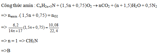 Đốt cháy hoàn toàn 6,2 gam một amin no, đơn chức phải dùng hết 10,08 lít khí oxi (đktc). Công thức của amin đó là