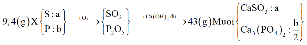 Ta có hệ phương trình \(\left\{ \begin{array}{l}{m_X} = 32{\rm{a}} + 31b = 9,4\\{m_{muoi}} = 120{\rm{a}} + 310.\frac{b}{2} = 43\end{array} \right. \to \left\{ \begin{array}{l}a = 0,1\\b = 0,2\end{array} \right.\)