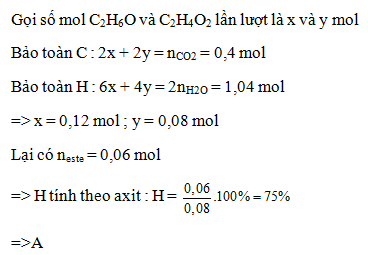 Đốt cháy hoàn toàn hỗn hợp X gồm ancol etylic và axit axetic thu được 8,96 lit CO2 (dktc) và 9,36g H2O. Nếu thêm H2SO4 ( đóng vai trò xúc tác ) vào hỗn hợp X và đun nóng thu được 5,28g este thì hiệu suất phản ứng este hóa là bao nhiêu ?