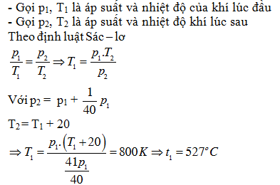 Đun nóng đẳng tích một khối khí lên 20oC thì áp suất khí tăng thêm1/40 áp suất khí ban đầu. tìm nhiệt độ ban đầu của khí.