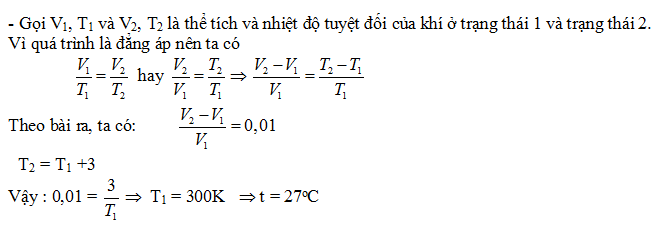 Đun nóng một lượng không khí trong điều kiện đẳng áp thì nhiệt độ tăng thêm 3K ,còn thể tích tăng thêm 1% so với thể tích ban đầu. Tính nhiệt độ ban đầu của khí?