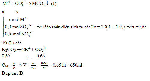 Dung dịch A có chứa các ion Ba2+, Mg2+ và Ca2+ 0,4 mol SO42-; 0,5 mol NO3-. Thêm từ từ dd K2CO3 1M vào dd A cho đến khi lượng kết tủa lớn nhất thì ngừng. V dd K2CO3 cần dùng:
