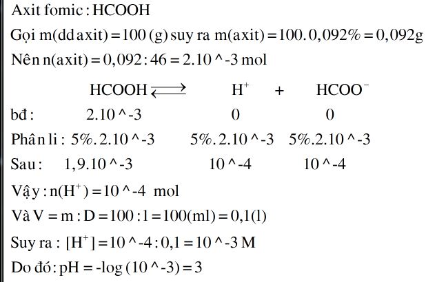 Dung dịch axit fomic 0,092% (d = 1 g/ml) có độ điện li α là 5%. Dung dịch axit trên có pH