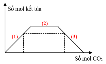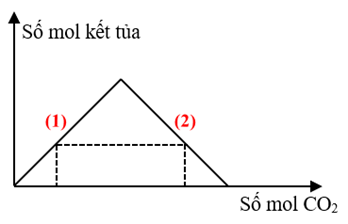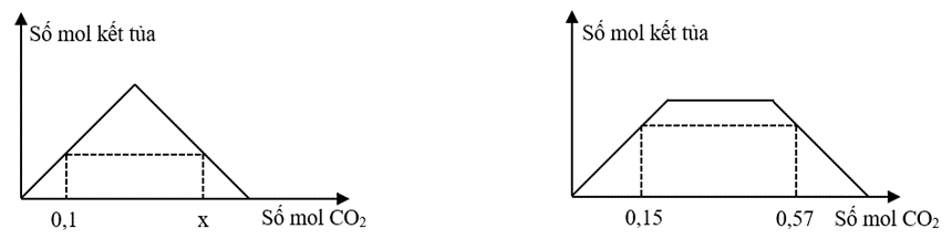 Đồ thị có dạng hình tam giác thuộc về phản ứng của dung dịch X với CO2 (gọi là đồ thị 1), đồ thị hình thang cân thuộc về phản ứng của dung dịch Y với CO2 (gọi là đồ thị 2).