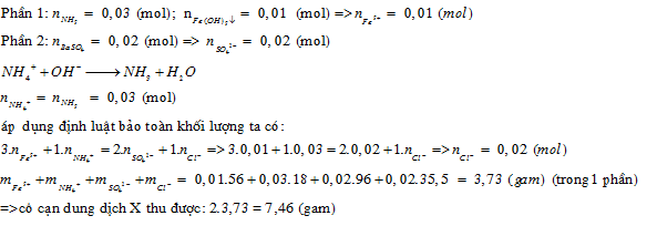 Dung dịch X chứa các ion: Fe3+ ; SO42 ; NH4+; Cl−. Chia dung dịch thành 2 phần bằng nhau: